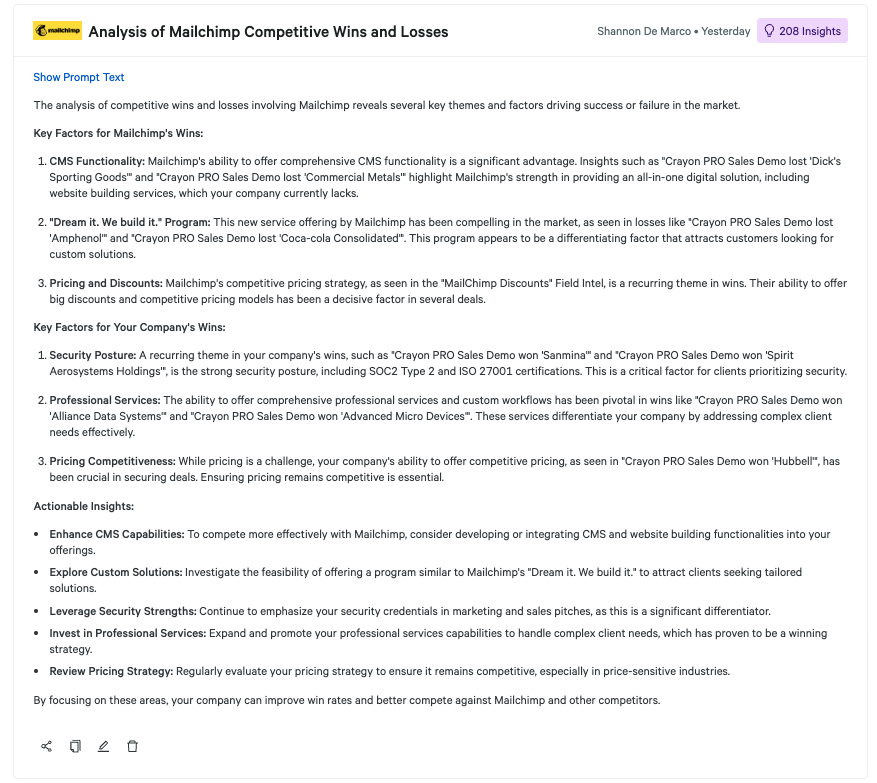 - Data Types: Gong Call Clips | CRM Won & Lost Opps | Field Intelligence | Case Studies | CRM Seller Notes | Third Party Win-Loss | Clozd Win-Loss | Chorus Call Clips