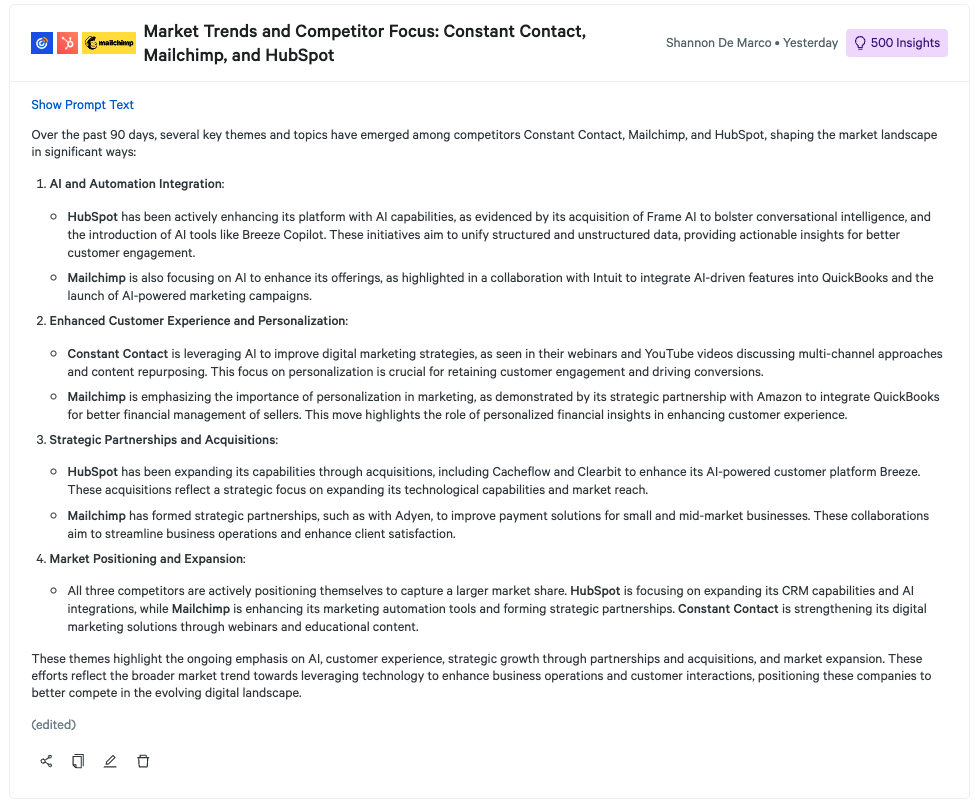 Stay up-to-date on recent market trends and competitor priorities by identifying key themes and topics from the past quarter. By understanding what competitors are discussing and why it matters, you can align your strategies to address emerging opportunities or threats. Perfect for teams looking to maintain a competitive edge and stay informed about market dynamics.