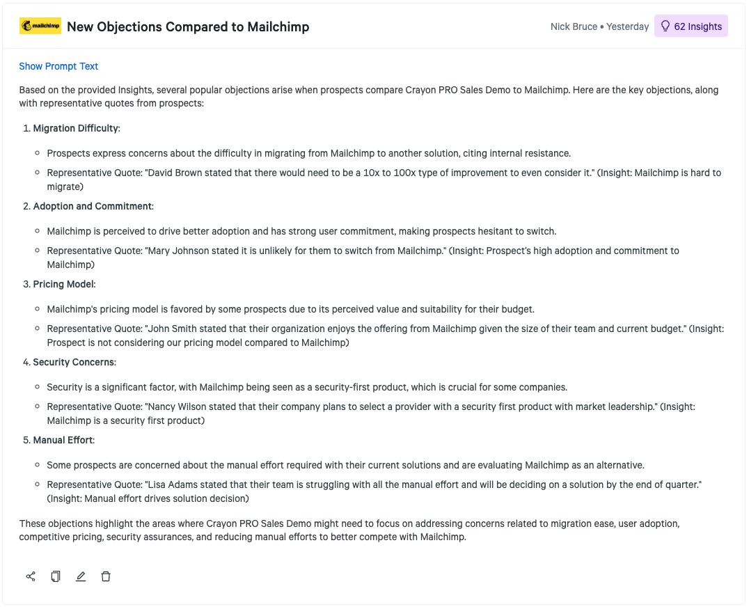 Help your sales teams stay prepared by uncovering the latest objections prospects raise about competitors. What are prospects asking and how are your sellers responding? By analyzing these objections and pairing them with real quotes, teams can refine their responses, sharpen their positioning, and build confidence in competitive conversations. Ideal for equipping your team to win against tough competitors.