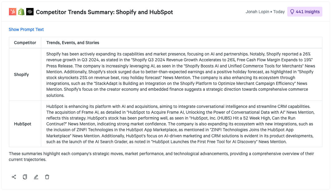 Stay informed with a clear summary of key news, trends, and events shaping the strategies of your competitors. Quickly surface the most relevant stories to support sales, marketing, and executive decision-making.