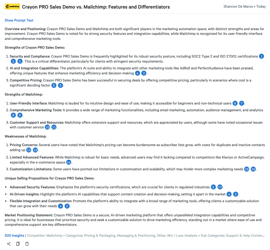 This prompt helps teams quickly perform products comparisons against competitors, highlighting key differentiators and opportunities. It streamlines the creation of market positioning statements, unique selling points, and battlecards, ensuring sales, product marketing, and CI teams can position effectively and win more deals.