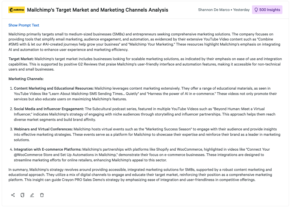 Help sales teams understand a competitor's audience and the marketing strategies they use to engage them. By uncovering their target market and preferred channels, your team can better position your offerings, refine messaging, and identify opportunities to differentiate. Ideal for creating more effective sales and marketing strategies.