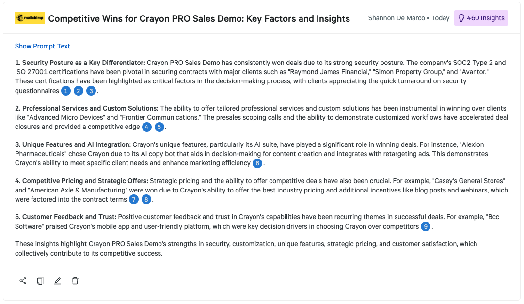 Craft compelling win stories that can help your sales team replicate success and build confidence in competitive deals. This prompt enables you to extract key insights from recent deals, highlighting what worked, why you won, and how to replicate it. Use these stories in sales enablement, battlecards, or internal newsletters to motivate your team and share best practices.