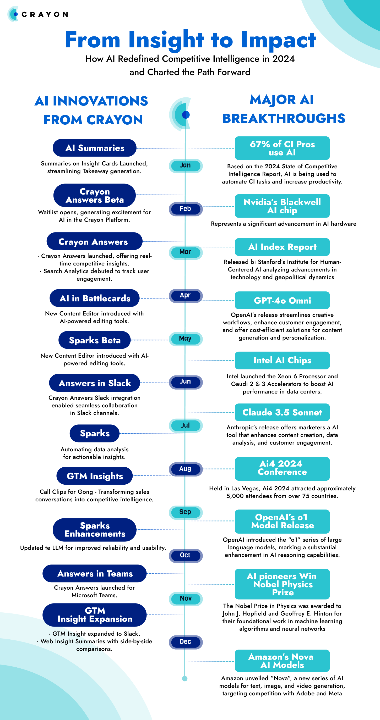 The timeline below highlights the most significant advancements in AI, from game-changing industry milestones to Crayon’s own contributions in redefining how CI teams turn insights into impact.