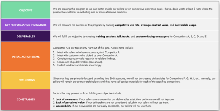 - Initial action items: Meet with sellers who have success against [top competitor]; meet with customers who picked us over [top competitor]; conduct secondary web research to validate findings; create and ship deliverables; collect feedback
