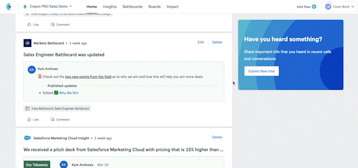 This makes it easy for your Crayon Admins to stay on top of questions and concerns, and also gauge which insights are most impactful for your sales team based on how much interaction and conversation they generate.