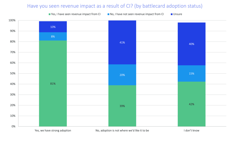 And if you’re thinking the consequences of weak battlecard adoption are marginal, you’ve got another thing coming: Compared to companies that are unhappy with current levels of battlecard adoption, companies with strong adoption are more than twice as likely to report direct revenue impact as a result of CI.