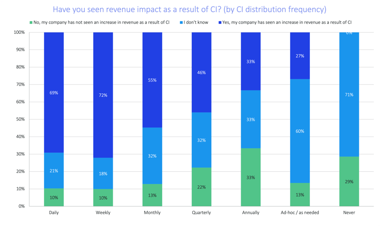 More specifically, compared to companies that share CI on a monthly basis, companies that share CI on a weekly basis are 31% more likely to report direct revenue impact.