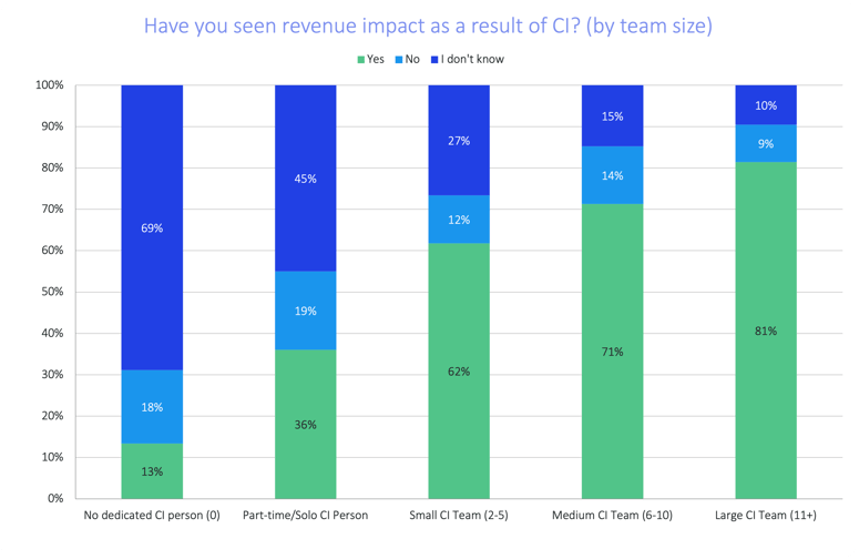 Two obvious commonalities come to mind: big teams and big budgets. Compared to companies with small CI teams (2-5 people), those with large CI teams (11+ people) are 31% more likely to report direct revenue impact as a result of competitive intelligence.