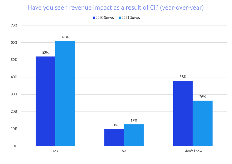 And compared to companies with CI budgets in the $25,001-$100,000 range, those with CI budgets in the $500,001-$1M range are 22% more likely to report direct revenue impact.