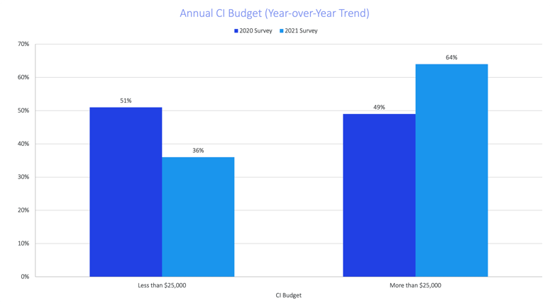 As CI teams get larger and increasingly important within their businesses, the need for reliable, detailed, and easy-to-use tools continues to grow. Not only are organizations dedicating personnel to their programs, but 64% say their annual CI budget exceeds $25,000 (compared to only 49% in 2020).