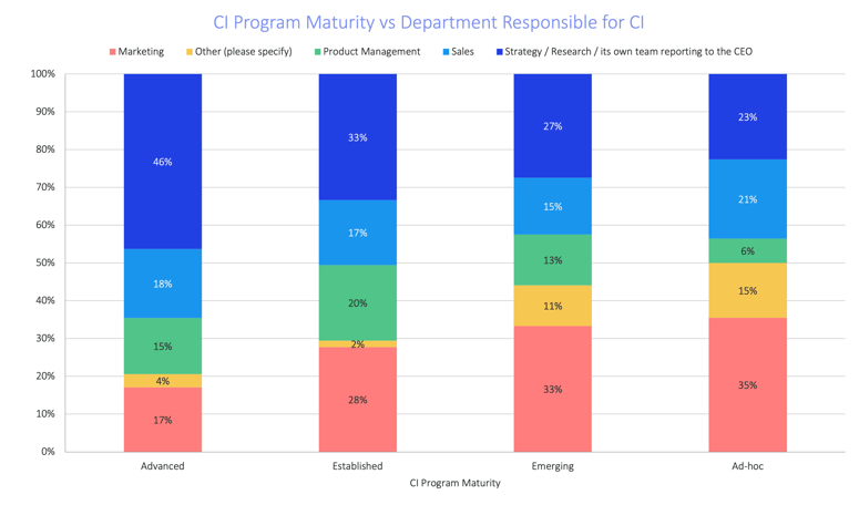 27% of businesses now report CI headcount of 11 or more, compared to just 15% last year. These are growing teams that, within their respective companies, are rising in terms of maturity and sophistication. Respondents to our survey described their CI programs on a range from “ad-hoc” to “advanced,” and when asked who their CI departments report to, it’s clear that the majority report either into marketing or directly to the CEO.