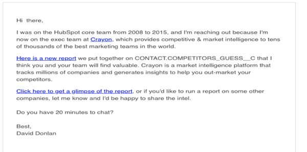 Always lead with a differentiator. For Crayon, one of our strengths is that we collect a wide range of incredible data from seven million sources, which is why we lead with the value of our data. This email is sure to grab their attention and they’re likely more interested in engaging in a conversation. Now they’ve seen what the product is capable of accomplishing. It’s critical to track your emails and conversations in your CRM. You want to make sure that you’re following up regularly, and continuing to nurture the relationship.