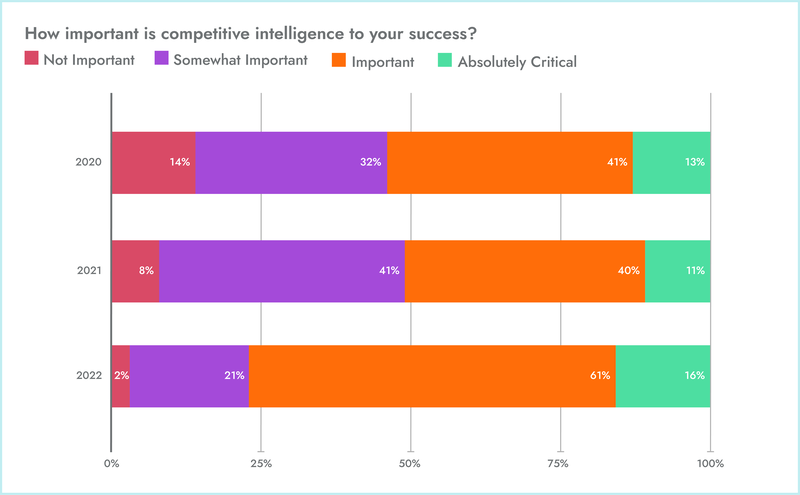 For our stakeholders, of course, more competition means more pressure—more pressure on product managers to differentiate offerings, more pressure on marketing teams to perfect their messaging, more pressure on sellers to say the right things in the right moments, and so on. It makes perfect sense, then, that compared to two years ago, those stakeholders are 23% more likely to say CI is “absolutely critical” to their success.