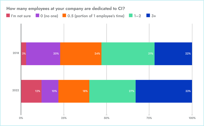 Competitors multiplying and stakeholders clamoring for intel? That sounds like a combination that would naturally drive increased investment in CI. And sure enough, when we compare the response data from our 2018 survey to the response data from our 2022 survey, we’re presented with growth in both dedicated CI budget and dedicated CI headcount.