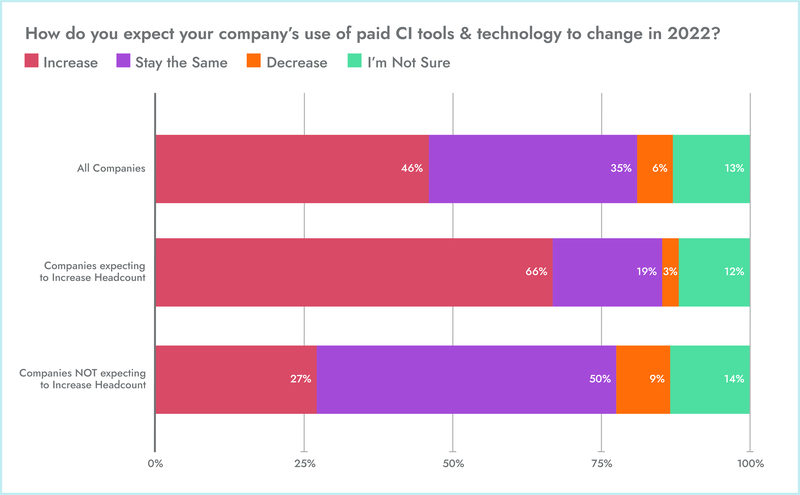 Based on our survey results, one could assume that many CI teams are using their budget to equip practitioners with technology. In fact, nearly half of our respondents expect their companies to increase their use of paid CI solutions in 2022.