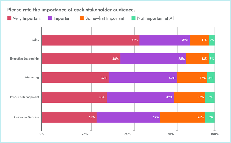 When an organization understands the value that competitive intelligence offers, the activation of CI initiatives quickly translates into business impact: by making it easier for product managers and marketers to differentiate, by making it simpler for sellers to say the right things in the right moments, and so on. This year, practitioners are clearly doing their best to drive the broadest possible impact, with each key stakeholder group being described as at least “somewhat important” by 95% of our survey respondents.