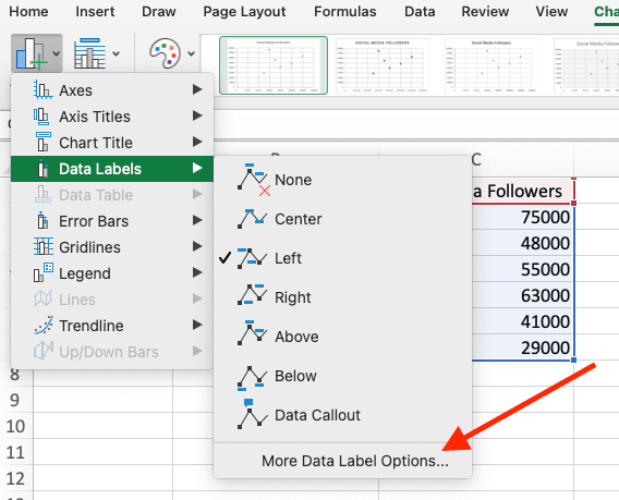 Now we’re getting somewhere! Next, head back to that same Add Chart Element drop-down menu, hover over Data Labels, and select More Data Label Options.