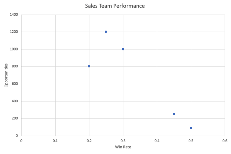 Now, our sales team performance matrix is divided into four quadrants: low win rate, low opportunity volume; low win rate, high opportunity volume; high win rate, low opportunity volume; and high win rate, high opportunity volume.