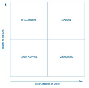 Gartner’s Magic Quadrant plots each company by their Ability to execute and their Completeness of vision. The best-performing of both are Leaders, and the lowest-performing of both are Niche Players. The innovative solutions who have yet to execute are the Visionaries, and the execution-oriented but not-so-innovative companies are the Challengers.