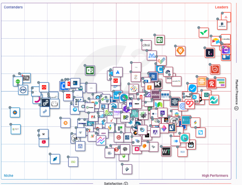G2’s comparative matrix plots each company by Market Presence and Customer Satisfaction. Companies with a large market presence and high customer satisfaction (based on reviews on their site) are deemed Leaders, while those with low presence and low satisfaction are designated Niche solutions. Contenders (large market presence, low satisfaction) and High Performers (low presence, high satisfaction) round out the grid.