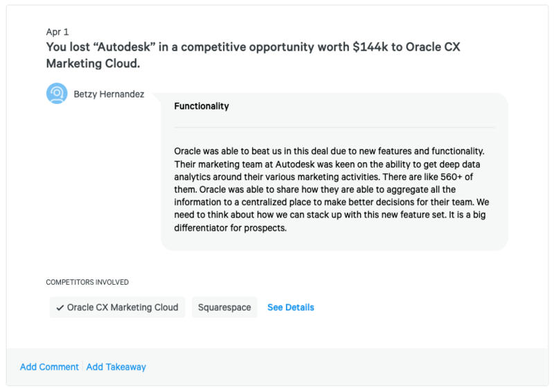 Can you do competitive win loss analysis using some frankensteined amalgam of Salesforce and Excel? Yeah, sure. This makes sense when your reps are losing deals because prospects won’t pick up the phone. But when they’re investing time and energy into a deal only to get it’s-not-you-it’s-me’d, Salesforce alone isn’t going to cut it.
