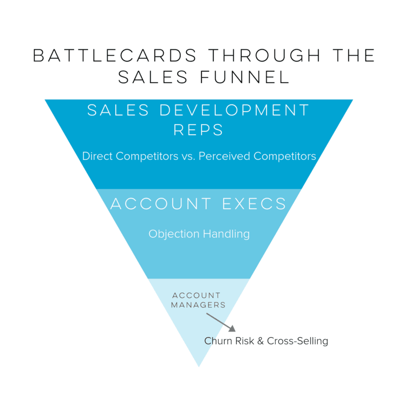 Most organizations only create battlecards designed for their closing sales team. Why should that be the case? Sales functions that occupy other parts of the sales funnel, like sales development and account management, also frequently encounter competitive scenarios. Those teams could use the battlecards created by product marketing or sales enablement, but remember: those battlecards were built for sales reps. Sales development reps and account managers require very different amounts and types of information when they face competitors.