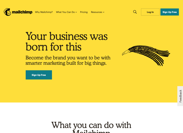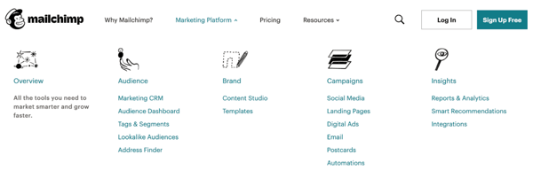 Fast forward to today, MailChimp is repositioning their messaging to communicate that they do more than just send emails. They now have solutions for social media, branding, audiences/CRMs, and much more. AKA, “smarter marketing” as a whole.