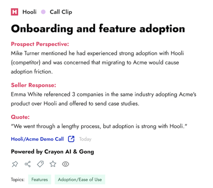 Introducing Call Clips for Gong. If you use Gong for call recordings, you can now get summarized call clips from conversations about your competitors — automatically, in real-time. The best part? This is part of Sparks. Take thousands of hours of calls and transform them into actionable sales enablement – battlecard tiles, SWOT analysis, and more! (Chorus and other call recording software tools coming soon).