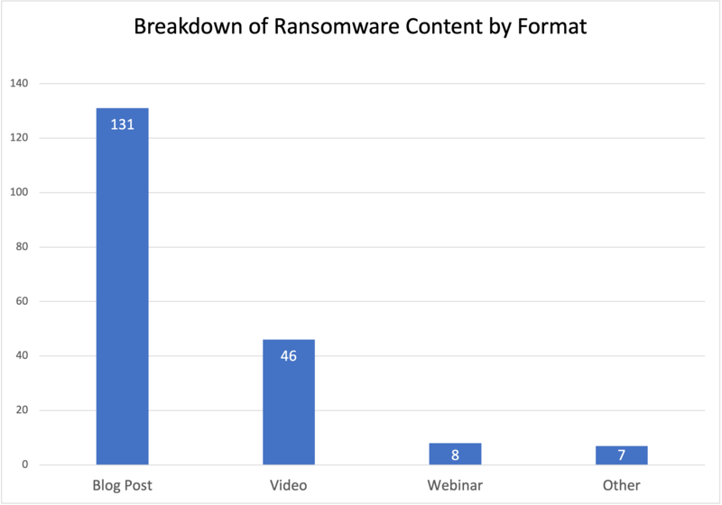 That blog posts are so heavily favored when discussing ransomware is not surprising—nor is it necessarily a bad thing. Blogging has long been an effective content marketing tool for B2B companies, and given the spike in interest picked up by Google, publishing ransomware-related blog posts seems like a sensible way to drive website traffic.