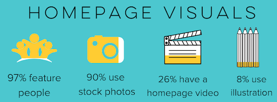 The healthcare industry often handles products or services that are considered confidential, so, it may be hard to effectively showcase what they do using images on their website. Due to that, it’s unsurprising that 90% of websites featured stock photos on their homepage and only 43% show off pictures of their product or service on their homepage.