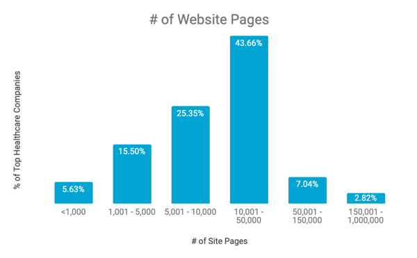 The average number of website pages for the industry is 22,405. The most common range for the number of webpages was between 10,001 and 50,000. If you read our last website analysis post of the Top 100 Tech Companies, those websites had on average, 23,348,527 website pages. The reason for the stark difference is that many technology companies are B2C, so they host many product pages or are companies such as social networking sites. The majority of these healthcare companies are not selling products that customers can simply add to a virtual cart, but they do have a lot of web content about careers, product specs, press, and events, building up their website. Surprisingly, a little more than 5% of websites had less than 1,000 website pages.