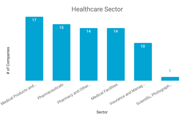 Healthcare is an industry that has many sectors, which were classified as “Pharmaceuticals,” “Pharmacy and Other Services,” “Medical Facilities,” “Medical Products and Equipment,” “Insurance and Managed Care,” and “Scientific, Photographic, and Control Equipment.” The most common sector is “Medical Products and Equipment,” with 17 out of 71 companies falling into that category.