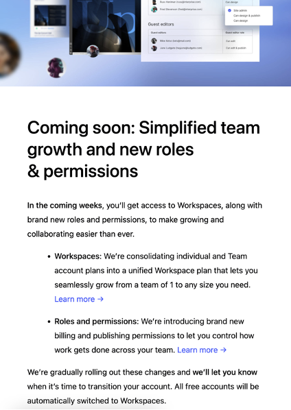Sales and marketing emails, if you can get copies of them, can provide a more informal version of the company’s messaging. You may even start to see variations of messaging being tested by different individuals, and get hints of where the messaging may be going. My favorite application of email-driven competitor messaging analysis, however, is product-focused. Take a look at how Webflow uses email to announce a new feature, Workspaces: