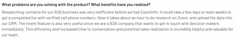 Check out this excerpt from a review of ZoomInfo, a B2B sales tool:
