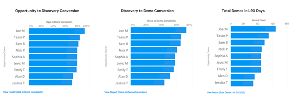Now that you’re tracking the key leading indicators to success, make sure you’re tracking the relative conversion rates of each stage. How many leads convert to Discovery Calls? How many Discos result in a Demo? What’s your Demo to Close conversion? Where do you see gaps? Where can you improve?
