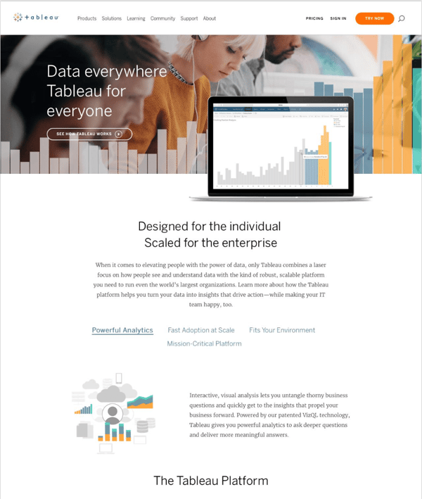 A great example of this is from Tableau, an interactive data visualization software company. They host a video right in the header of their product page. It’s just over two minutes long, which is the perfect length to give visitors an overview of the product, while also not taking too much of their time. This dynamic product visualization will likely resonate with visitors more than a product screenshot because it’s more of a product experience than a simple text explanation.