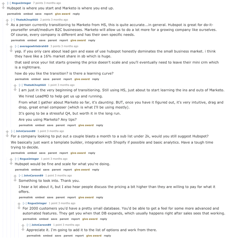 Head over to Reddit and see if your industry has a dedicated subreddit. If so, you’re bound to see some interesting threads on redditors asking for advice on the best email marketing software, or best CRM software, etc. Similar with reviews, pull out key themes from Q&A threads and run it against your win/loss analysis.