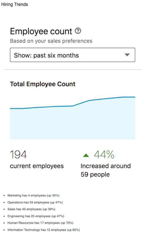 • Hiring Trends: growth or shrinkage in hiring by the competitor. Identifying specific departments doing a lot of hiring can be very helpful in understanding where the competitor is investing.