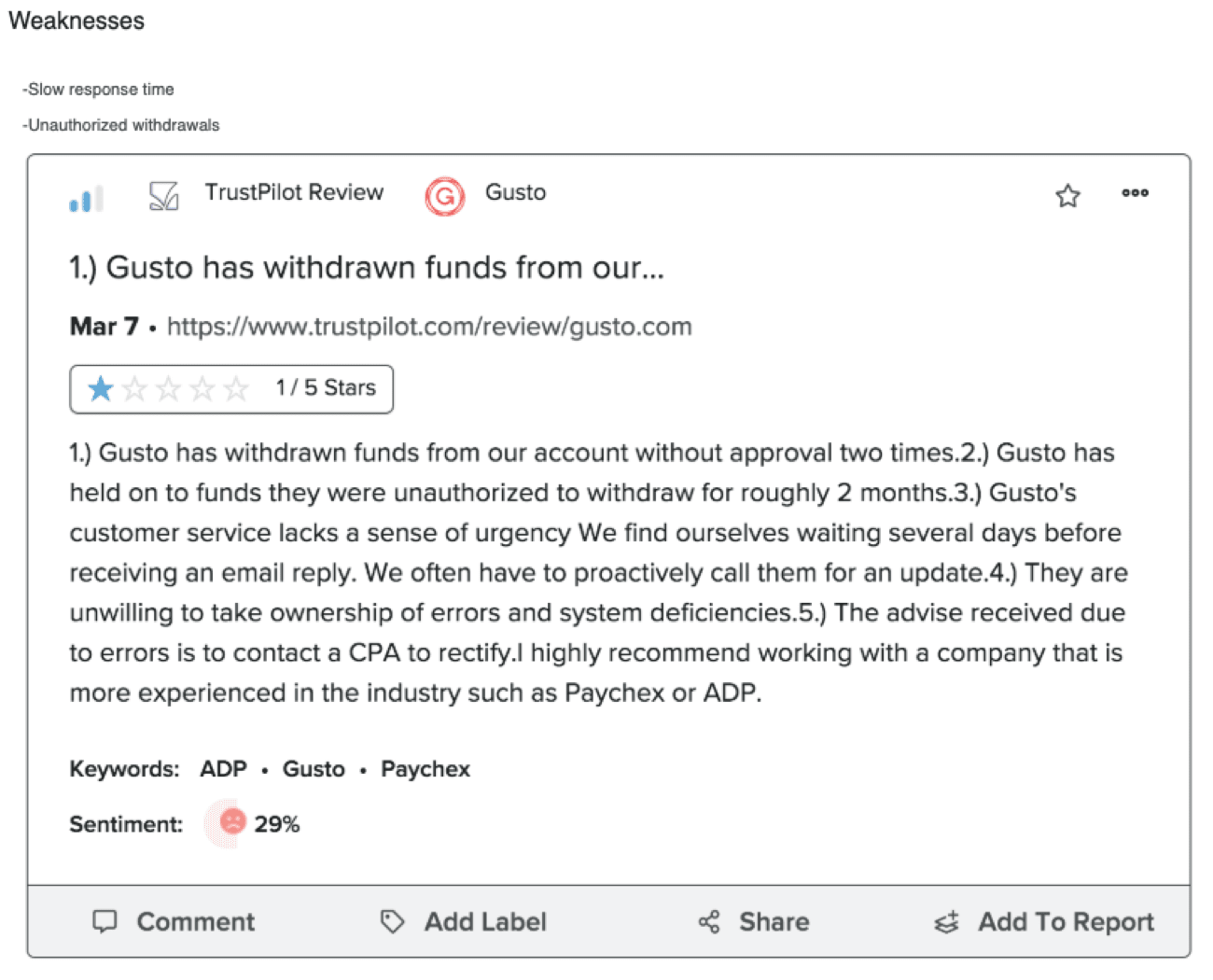 • Strengths: the competitor’s strengths as a company and as a product. Unless you’re in very feature-focused deals, it makes sense to frame these in terms of your central value propositions more so than technical advantages.