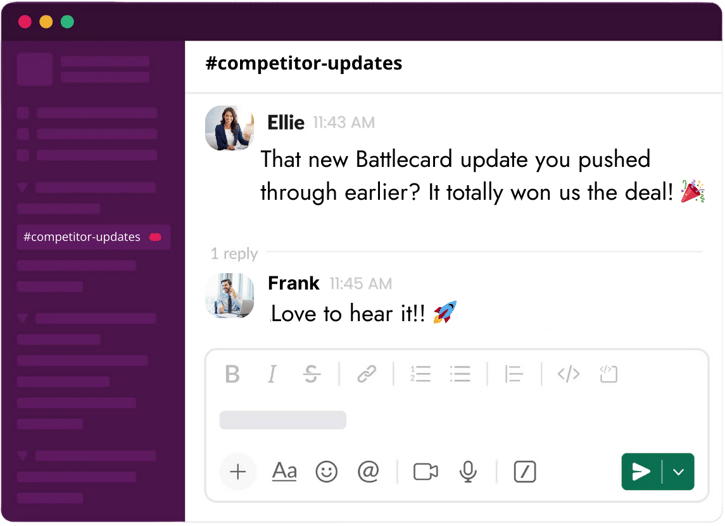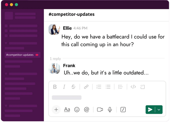A rep pings you before a big sales call—not to ask if a battlecard exists, but because they already got the latest insights in Slack that morning.