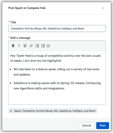 Why this matters: Insights are only useful if they reach the right people, at the right time. Leveraging Sparks with Compete Hub ensures Sales your team always has the intel they need—no more searching.