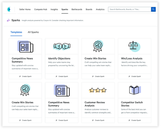 Sometimes deciding on which data to analyze is half the battle. With Simplified Sparks, you can now select a template, and Crayon generates a ready-to-use competitive analysis—no filtering, no digging.