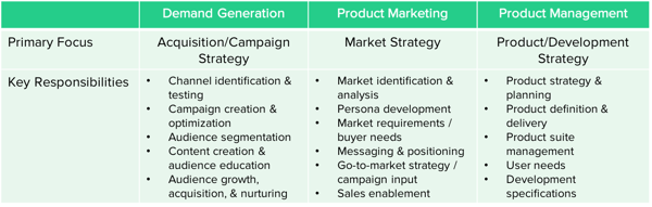Focusing on the market and the buyer (or persona) helps define how a product marketing team can drive strategy across departments. Market strategy is a key input for both product strategy and acquisition strategy, but leaves room for the product management and demand generation teams, respectively, to drive those efforts. Similarly, product strategy and acquisition strategy can feed helpful insights back to product marketing, such as positioning that does/doesn’t convert well or product usage metrics that point to some use cases being more/less urgent.