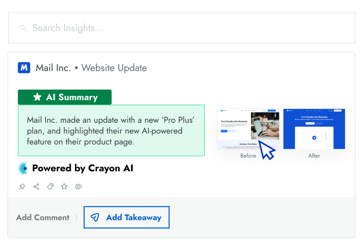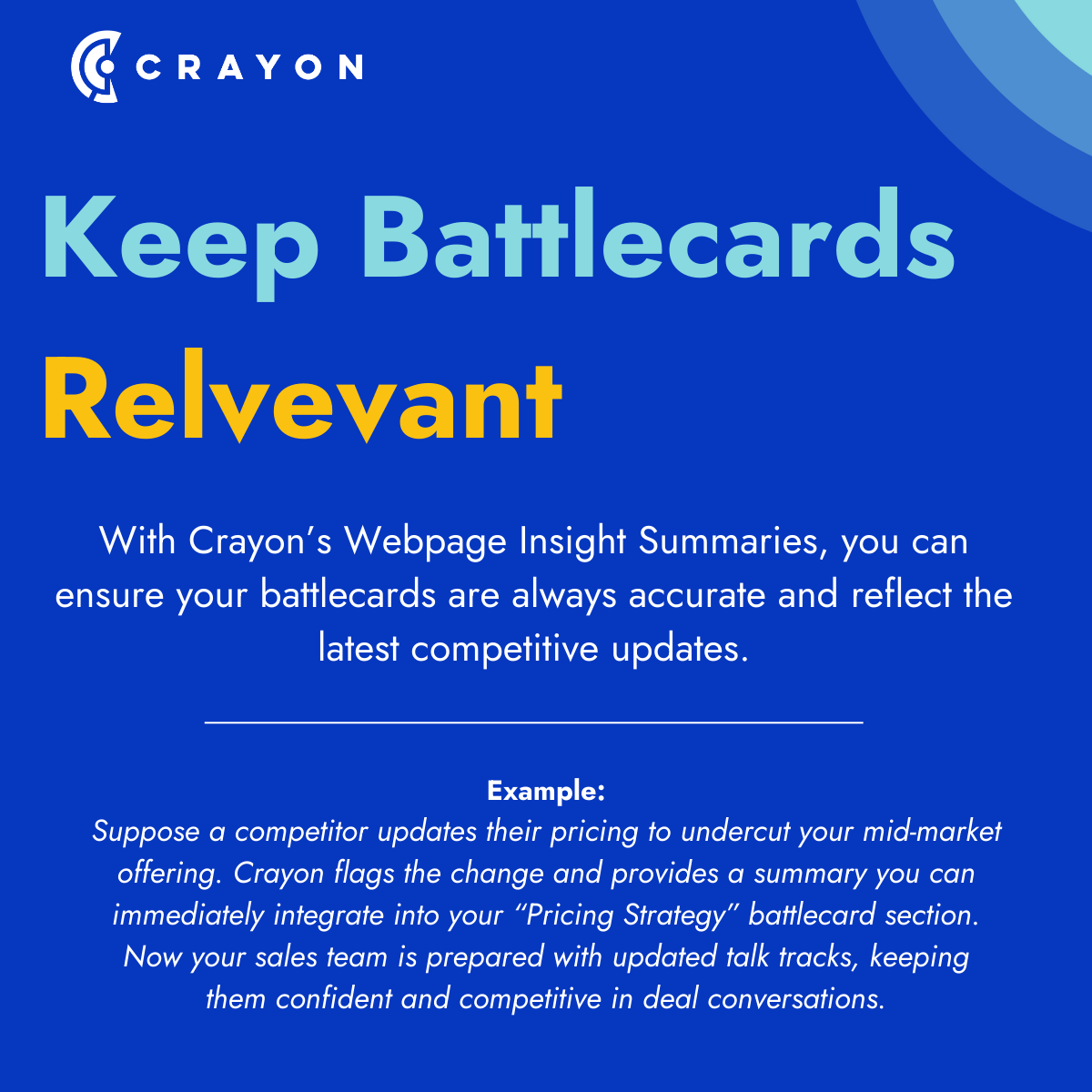 Keeping up with competitors isn’t enough—you need to know what their moves mean and how to respond. Crayon’s Webpage Insight Summaries makes competitor tracking effortless, helping your team focus on what matters—winning more deals and staying ahead of market shifts.