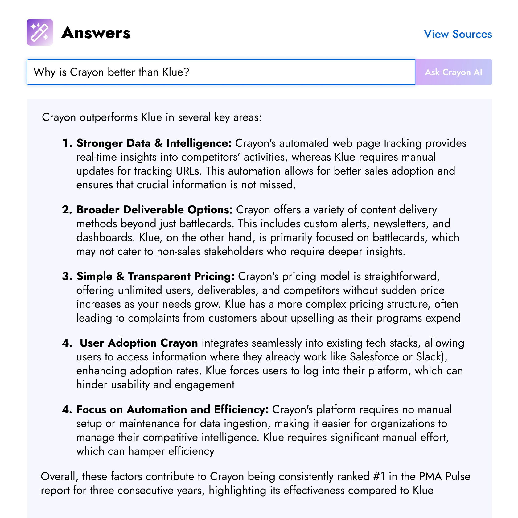 This is Crayon Answers, an industry first and an actual feature in Crayon. Sales teams simply ask a question about their competitors and receive an instant response.