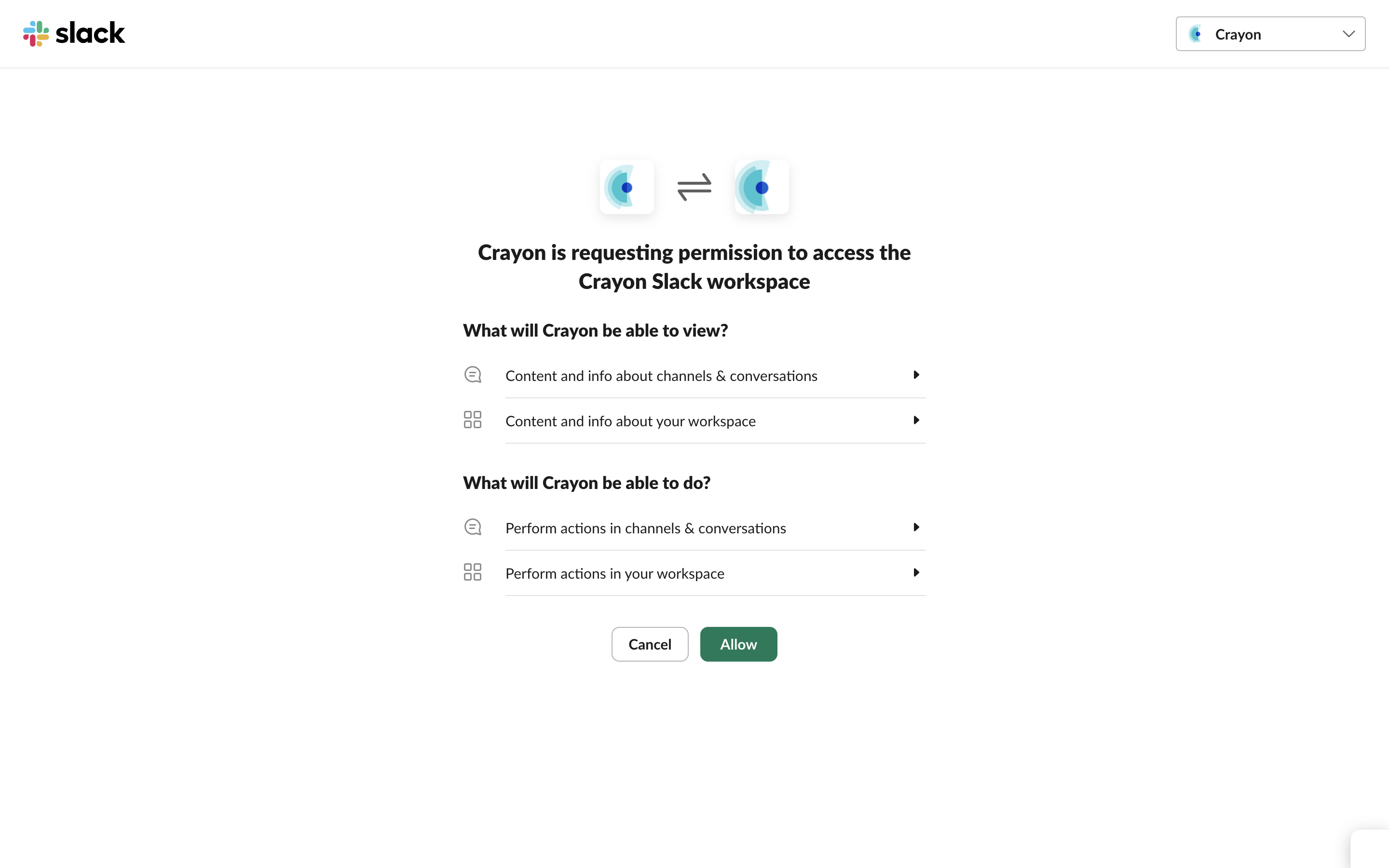 - The Crayon Slack App should now be installed successfully. You will receive a message in the Workspace where the application was installed indicating the success of the integration.