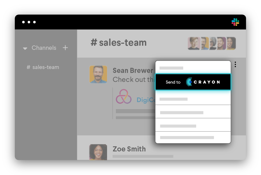 A powerful two-way integration allows your team members to send competitive intel from their Slack conversations into Crayon in a matter of seconds. Empower the entire organization to contribute to your CI program and grow a culture of competitive excellence.